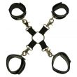Material: Couro, Madeira, Vinil. Conjunto de algemas para pulsos e tornozelos com dispositivo para restrição de movimetos em forma de X que se liga a cada uma das argolas nas algemas através de mosquetão.
