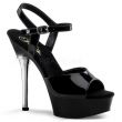 Produzidas com acabamento em vinil preto brilhante, com tira e fecho de fivela metálica no tornozelo permitem um ajuste perfeito. Os saltos são cromados e enfeitados com imitação de diamante na parte superior.