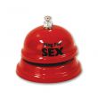 Contéudo: Livro de regras do jogo, plumas, meias e ligas. Campainha de balcão em metal vermelho com a inscrição em preto "Ring for Sex" (Tocar para Sexo).