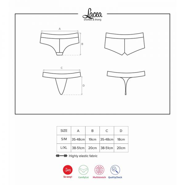 Boxer muito feminino e sensual em renda macia e elástica, com adoráveis motivos florais e um enlaçado ajustável em fita de cetim, tipo corpete na zona da frente.
