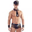 O conjunto é composto por cueca boxer, gola com gravata curta, punhos, e boné com crachá. As cuecas boxer são em rede net e vinil efeito molhado. A gola e os punhos dispõem de botões de pressão.