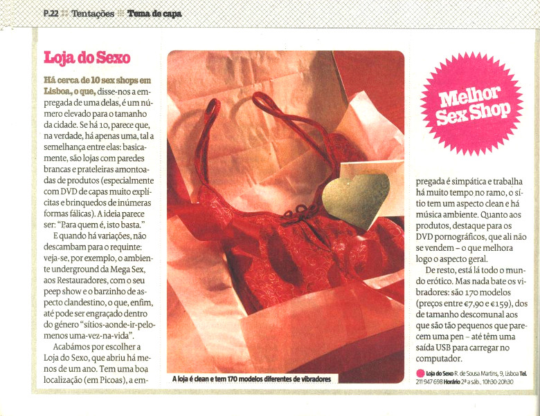 Revista Sábado - Lojadosexo.com melhor Sexshop de Lisboa 2012-05-19 A prestigiada revista Sábado desta semana, publicou os melhores spots de Lisboa no suplemento Tentações. E na categoria de Sexshop foi a nossa loja de Picoas que se destacou como a melhor Sexshop da cidade.