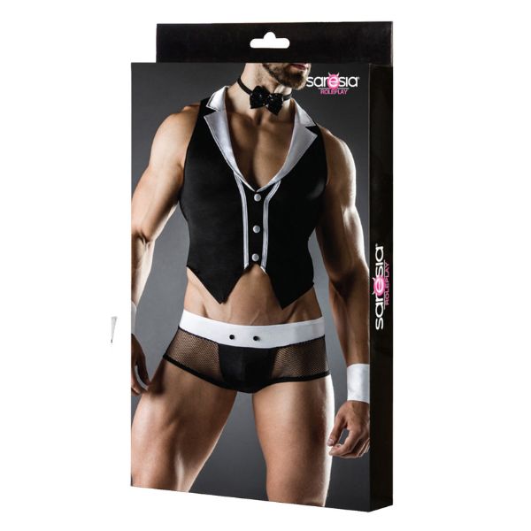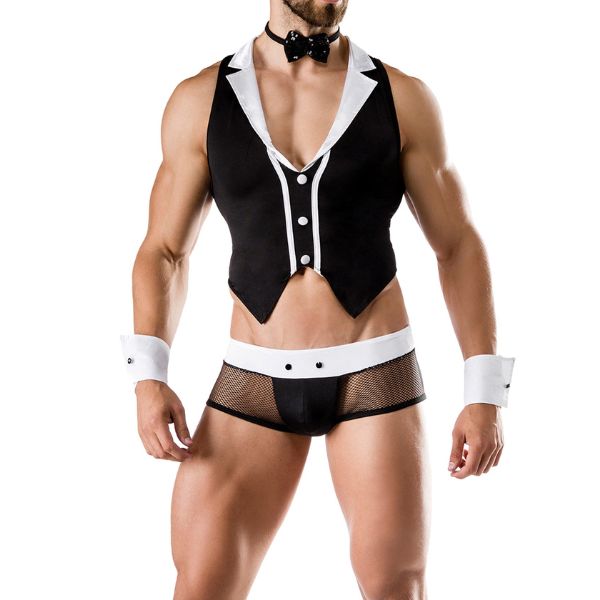 Surpreenda teu parceiro com esta incrível peça de roupa masculina, adicionando um pouco de diversão ao seu armário com esta clássica tanga de renda de smoking, combinada com uma alça de atleta na parte de trás, dando cobertura mínima e muita exposição.