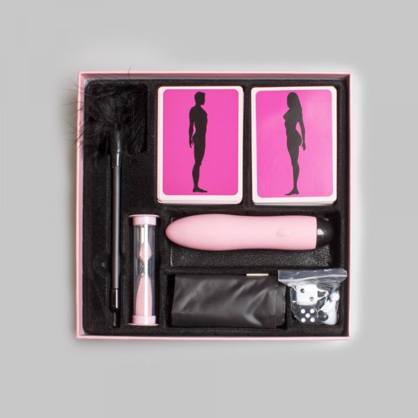 1 tabuleiro, 2 dados, 176 cartas de provas: 88 para ela, 88 para ele, 2 fichas, 1 vibrador, 1 pluma, 1 fita de cetim, 1 relógio de areia.