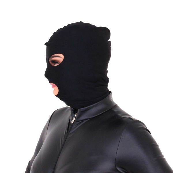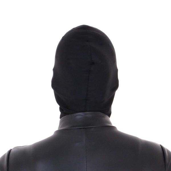 Material: 90% poliéster, 10% elastano. Máscara em couro com 2 aberturas totalmente ajustáveis na traseira da cabeça. Possui uma abertura no nariz e boca e venda nos olhos.