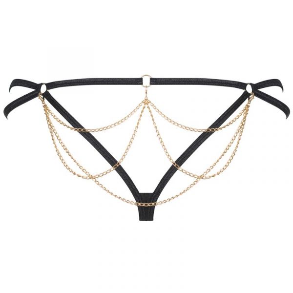 Em vez do aborrecido triângulo de tecido, tem duas tiras elásticas e uma linha de pérolas sobre a zona intíma.