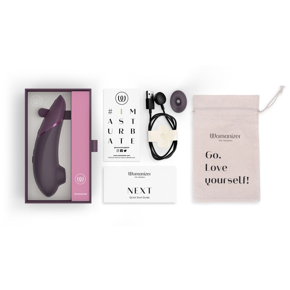 Inclui: Womanizer Premium 2, cabeça de estimulação extra maior, bolsa de armazenamento, adorno para clitóris, cabo de carregameno USB. Dimensões: 155 x 50 x 35 mm.