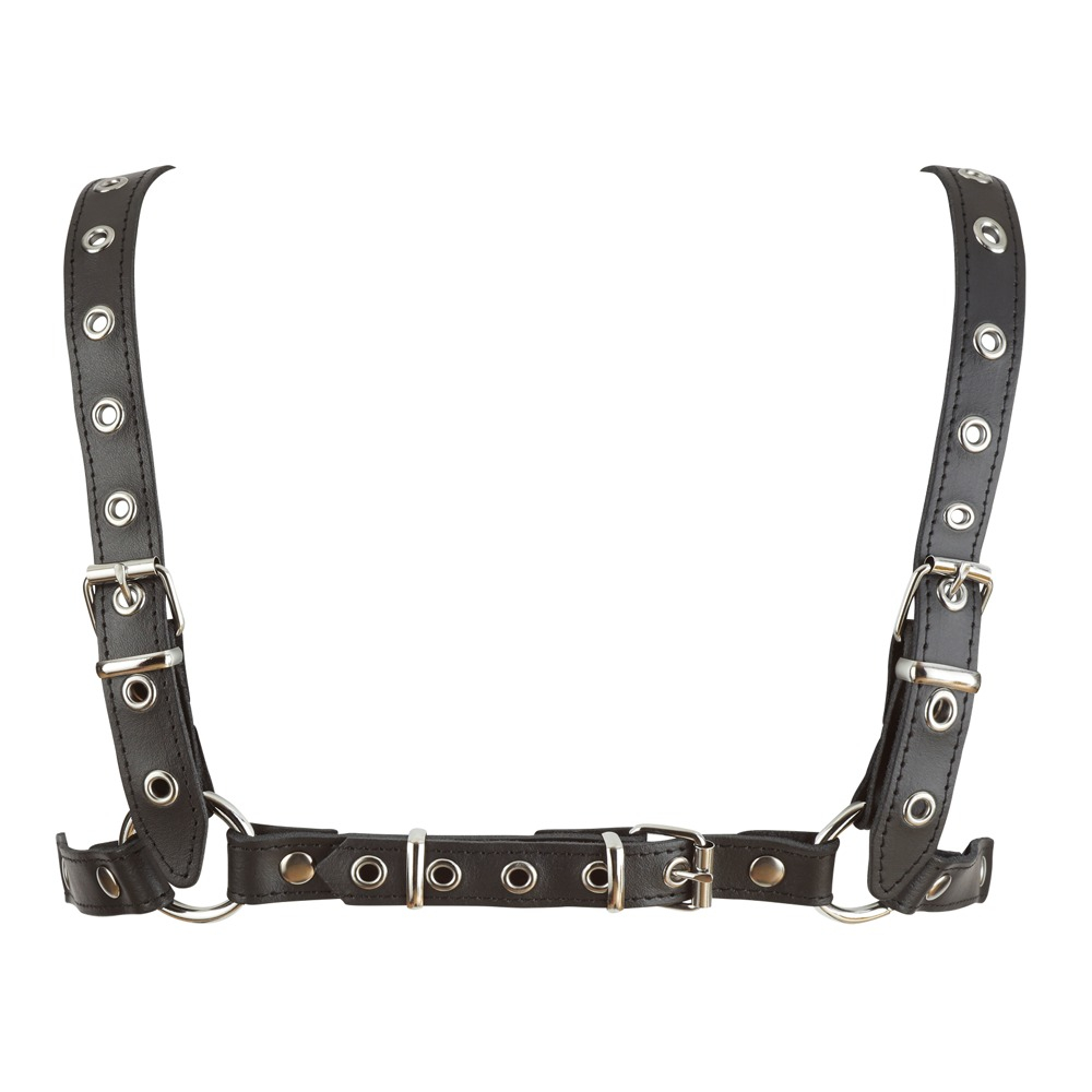 Arnês de peito em cintas negras de couro genuíno. As cintas negras são decoradas com pinos e anéis de aço para uma presença dominante.