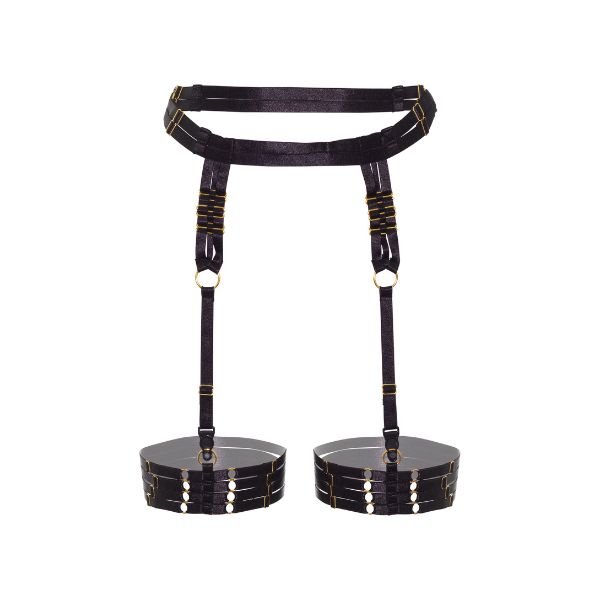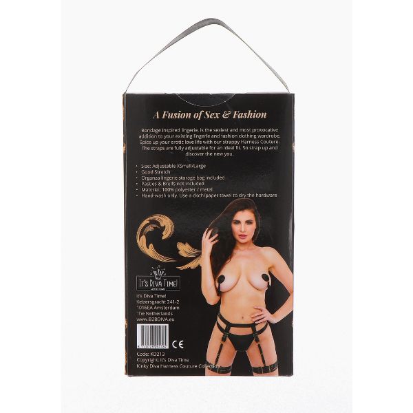Este arnês suspenso é fácil de colocar pois as fivelas douradas tornam as tiras elásticas de cetim ajustáveis.