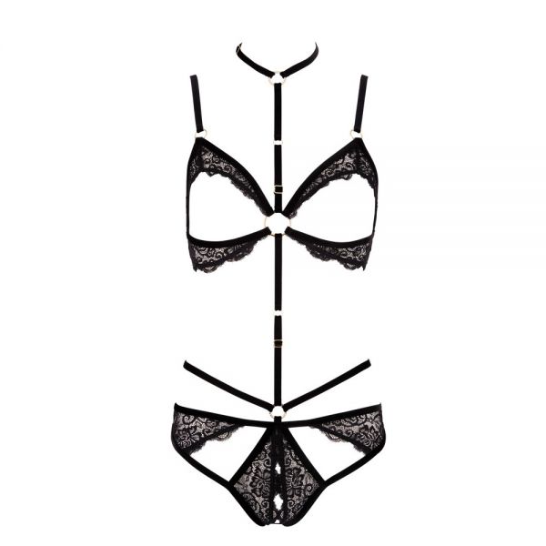 A lingerie feminina e prática para uma noite perfeita. É um produto de alta qualidade Chilirose, apresentado numa elegante caixa. Inclui: Body. Material: 90% Poliéster, 10% Elastano. Arnês corporal de cintas elásticas pretas decoradas com tachas e argolas de ligação. As correntes de metal removíveis atravessam a virilha para adicionar o toque final ao arnês.
