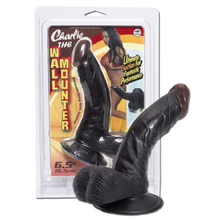 Pénis realístico negro com curvatura especial e poderosa ventosa para fixação numa parede ou outra superfície lisa.