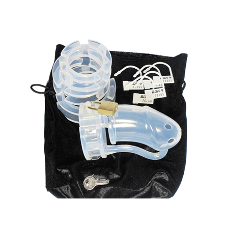 O kit contém: - 1 gaiola para o pénis com 9,50 cm x 3,5 cm. - 4 aros com os diâmetros interiores de 38 mm, 41 mm, 45 mm e 48 mm. - 4 pernos de fecho e 4 separadores. - 1 cadeado com 2 chaves. - 4 fechos em plástico numerados. - 1 bolsa de arrumação com fecho de correr. - 1 lubrificante 44 ml.