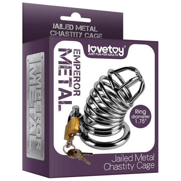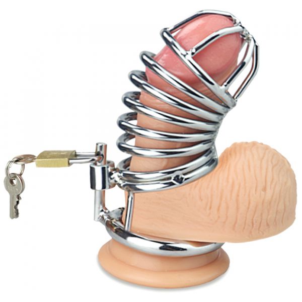 O kit contém: - 1 gaiola para o pénis com 9,50 cm x 3,5 cm. - 4 aros com os diâmetros interiores de 38 mm, 41 mm, 45 mm e 48 mm. - 4 pernos de fecho e 4 separadores. - 1 cadeado com 2 chaves. - 4 fechos em plástico numerados. - 1 bolsa de arrumação com fecho de correr. - 1 lubrificante 44 ml.