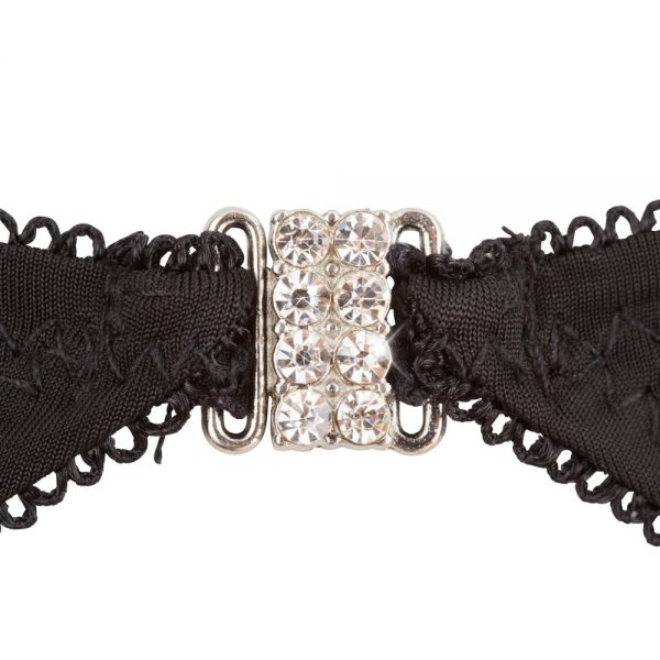 Material: 85% poliamida, 15% elastano. Gargantilha em tecido bordado com aplicações brilhantes. Ajuste ao pescoço por fita de cetim.