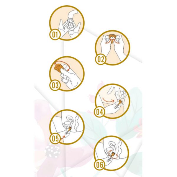 Poderá utilizar um pouco de lubrificante ou humedecer o tampão em água limpa para facilitar a aplicação. A posição ideal será sentada ou agachada. Esprema o tampão entre o polegar e o indicador, a ponta estreita em forma de seta, com as duas asas laterais formam um apoio para introduzir o tampão na posição correta. Abra com a outra mão os lábios vaginais e empurre o tampão com o dedo indicador tão profundo quanto possível, até tocar no colo do útero.