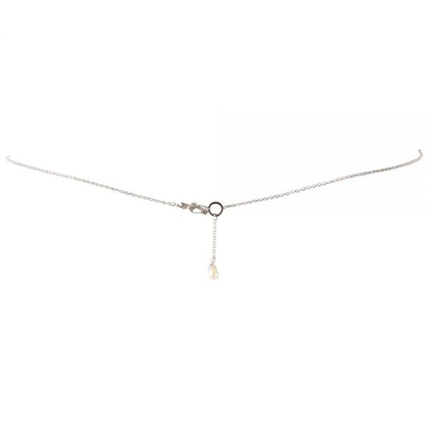 O colar é composto por três linhas elásticas de pérolas negras, com uma linha de pérolas que une à corrente de cintura e termina com uma convidativa pluma.