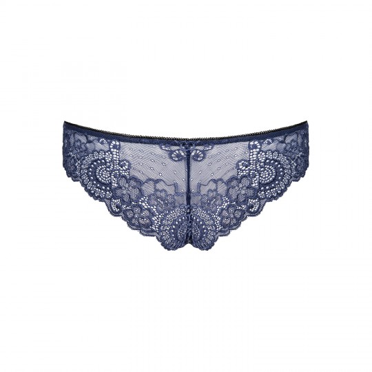 Sinta-se irresistível com esta irreverente cueca azul. Feita em renda elástica, com bordado floral e com um convidativo laço frontal acetinado.