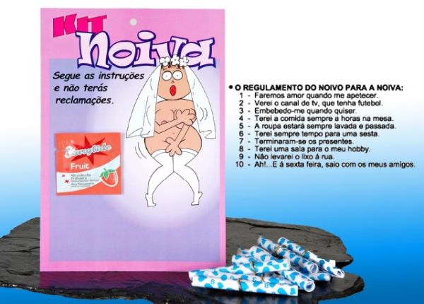 10 mensagens com o regulamento do noivo para a noiva. 1 lubrificante com aloé vera e aroma de chocolate (5ml.). Cartão 17 x 25 cm:"Segue as instruções e não terás reclamações".