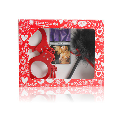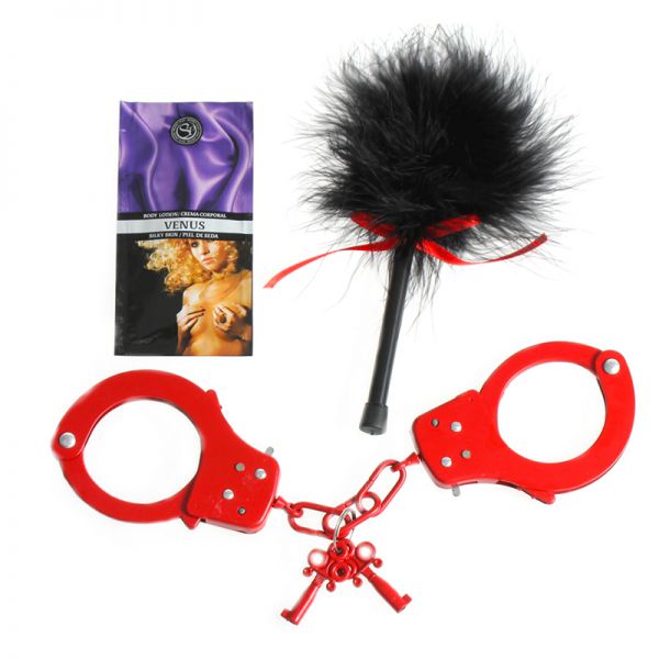Divirta-se em jogos eróticos plenos de romantismo com este kit. Prenda com as algemas, utilize a loção corporal para uma massagem muito sensual e utilize a pluma para estimulação das zona erógenas do seu parceiro.