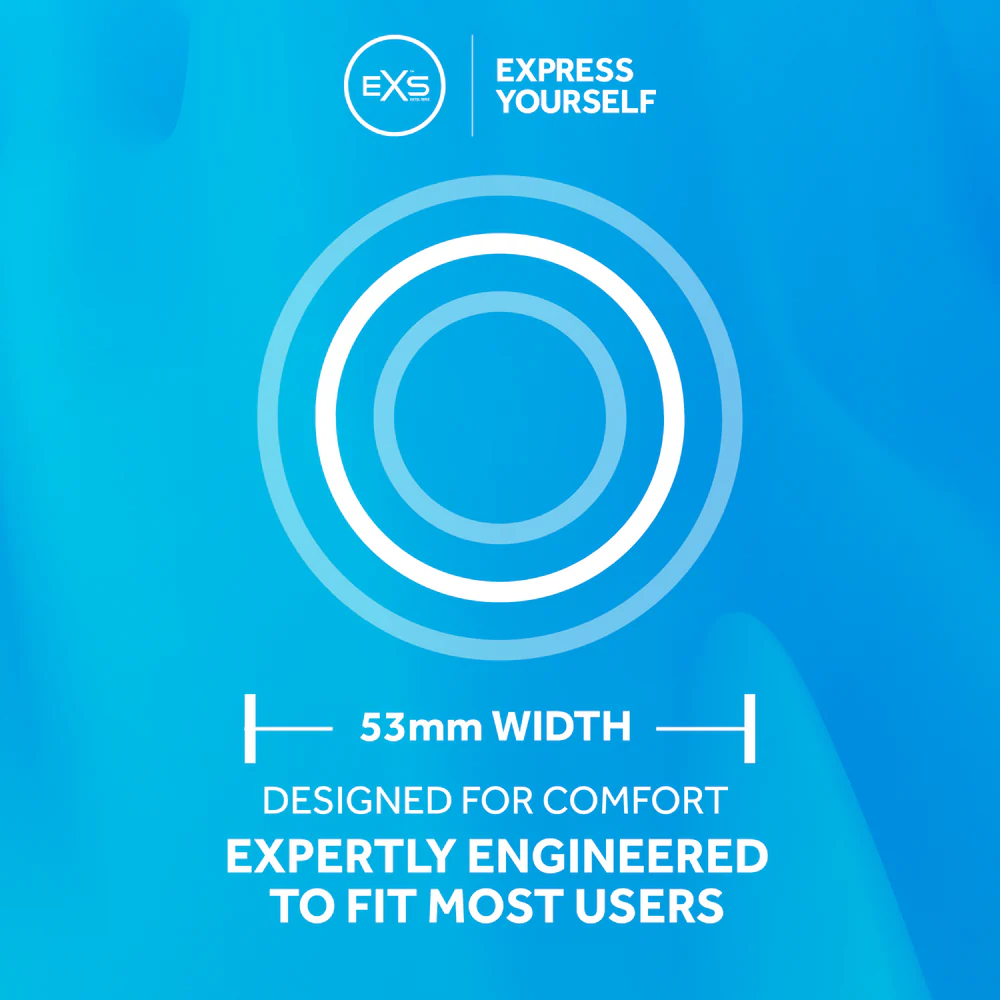 Os preservativos EXS têm um design único, com a ponta especial alargada para conforto total e natural. Sem cheiro de látex, sem sabor de látex, os preservativos EXS são inodoros e insípidos, oferecendo uma forma subtil, porém poderosa de proteção. Todos os preservativos EXS excedem os padrões de segurança ISO, são fabricados em fábricas regularmente inspecionadas e exibem as marcas CE e British Kite. Dimensões: 60mm de largura +/- 2 mm x 195mm de comprimento. Espessura de 0,073mm.
