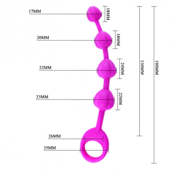 Dimensões: Comprimento total 21cm, inserível de 16,5cm Diâmetro das bolas: 1,2cm, 1,2cm, 1,6cm, 1,6cm, 2,0cm e 2,0cm.