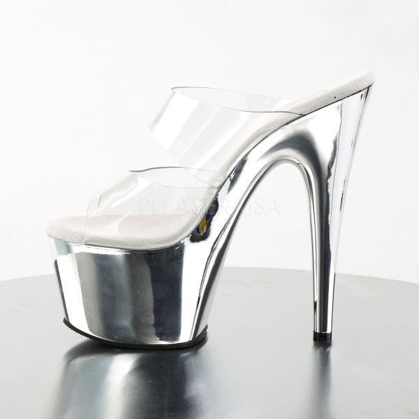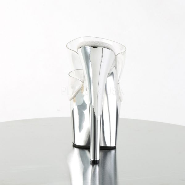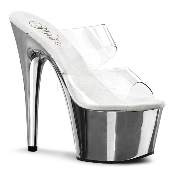 Sandália de plataforma de dimensões extra generosas. Especialmente concebida para pole-dance e strip-tease. Palmilha branca e plataforma transparente para realçar o mais importante, o seu corpo.
