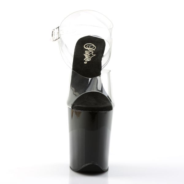 Sandália de plataforma de dimensões extra generosas. Especialmente concebida para pole-dance e strip-tease. Palmilha branca e plataforma transparente para realçar o mais importante, o seu corpo.