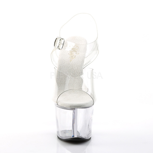 Sandália de plataforma de dimensões extra generosas. Especialmente concebida para pole-dance e strip-tease. Palmilha branca e plataforma transparente para realçar o mais importante, o seu corpo.