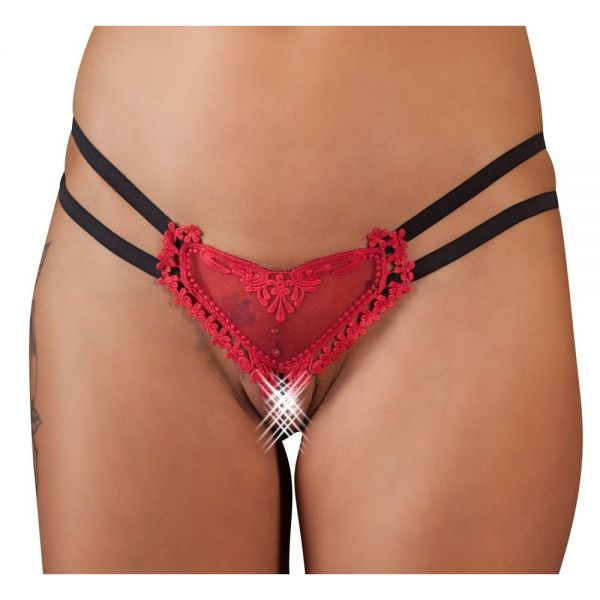 Tanga sexy com coração vermelho bordado na frente, segura atrás com duas bandas elásticas. Na virilha apenas uma banda que prende em laço atrás.