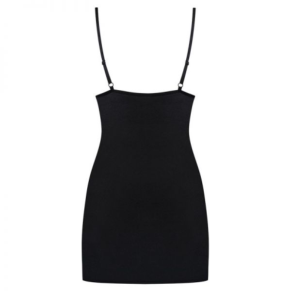 O vestido é decotado quer à frente quer atrás, as mangas são curtas, e tem um provocante fecho zip frontal de alto a baixo.