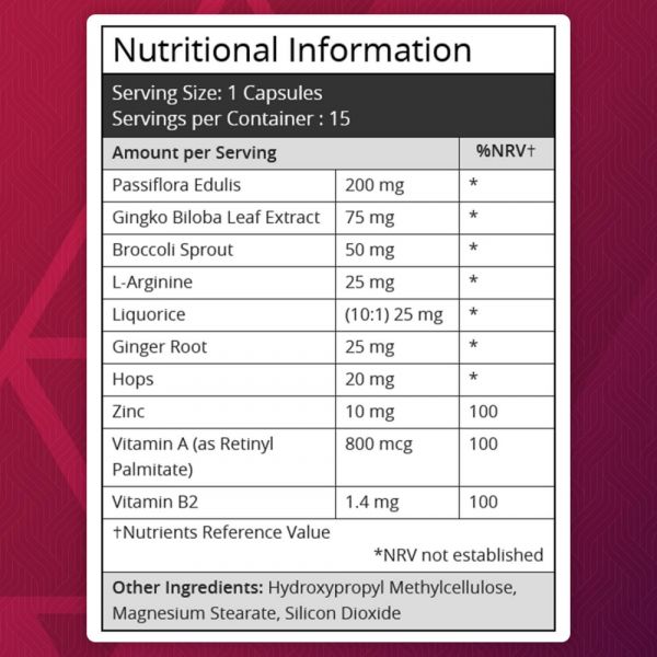 Composição: 50,8% Cardamomo em Pó, 17% Flocos de Aveia, Cápsula (Gelatina, Agente Colorido E171 e E172), Estearato de Magnésio (Agente de Separação) 5,1% Sémen de Guaraná em Pó, 1,7% Extrato de Casca de Marapuama, Niacinamida e Ácido Fólico.
