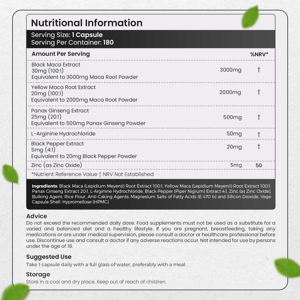 Composição: Vitamina E, Zinco, Butea Superba, L-Carnitina, Raiz de Maca, Pine Bark Extract, L-Arginina HCI, L-Lysine, Catuaba, Epimedium Sagitarium, Muira Puama, Hawthome, Extracto de Arando, Tribulus Terrestris, Extracto de Avena Sativa, Sarsaprilla, Pólen de Flor Sueco, Sementes de Abóbora