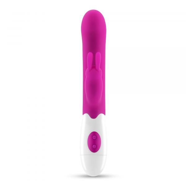 Vibrador recarregável com estimulador de clitóris em forma de coelho feito em silicone macio e sedoso de alta qualidade. Forma arredondada para maior estimulação do ponto G.